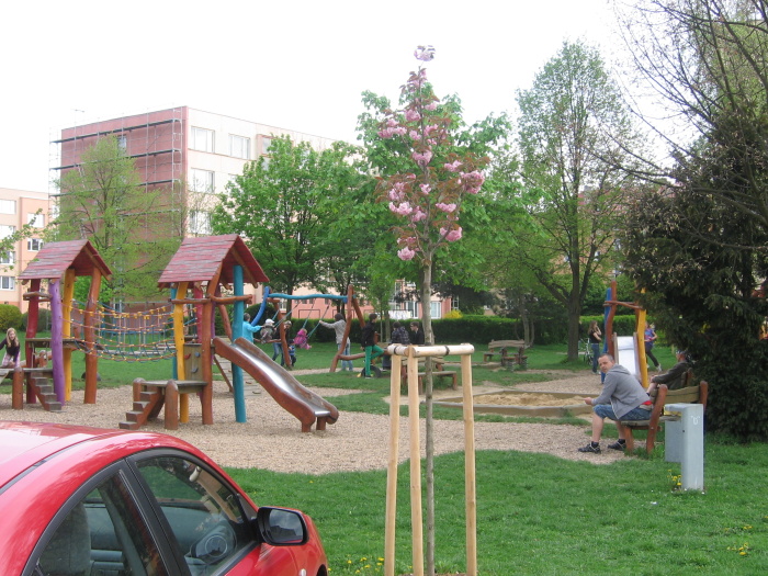 • třešeň pilovitá ʻKanzanʼ na roh dětského hřiště v Krátké ulici